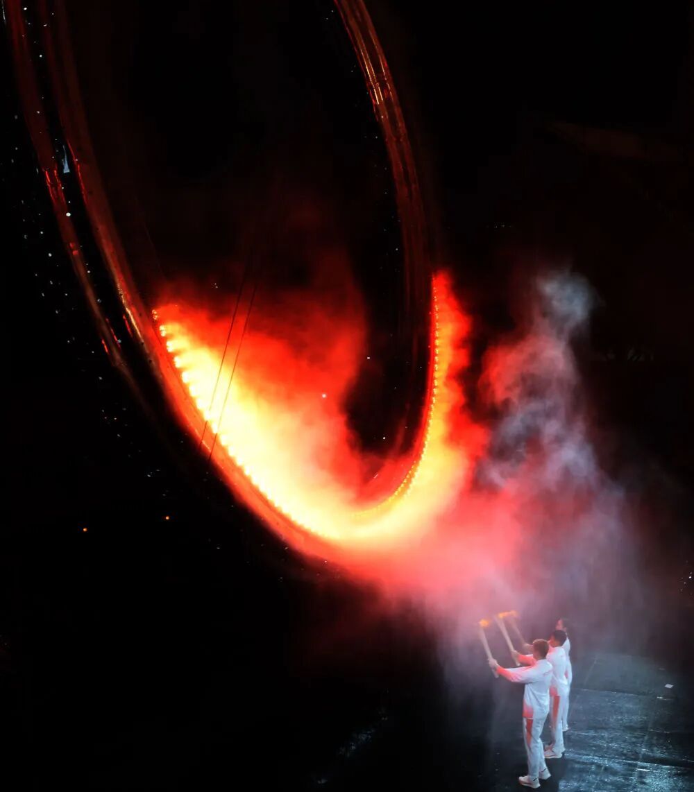 火炬手点燃主火炬。新华社记者 黄伟 摄